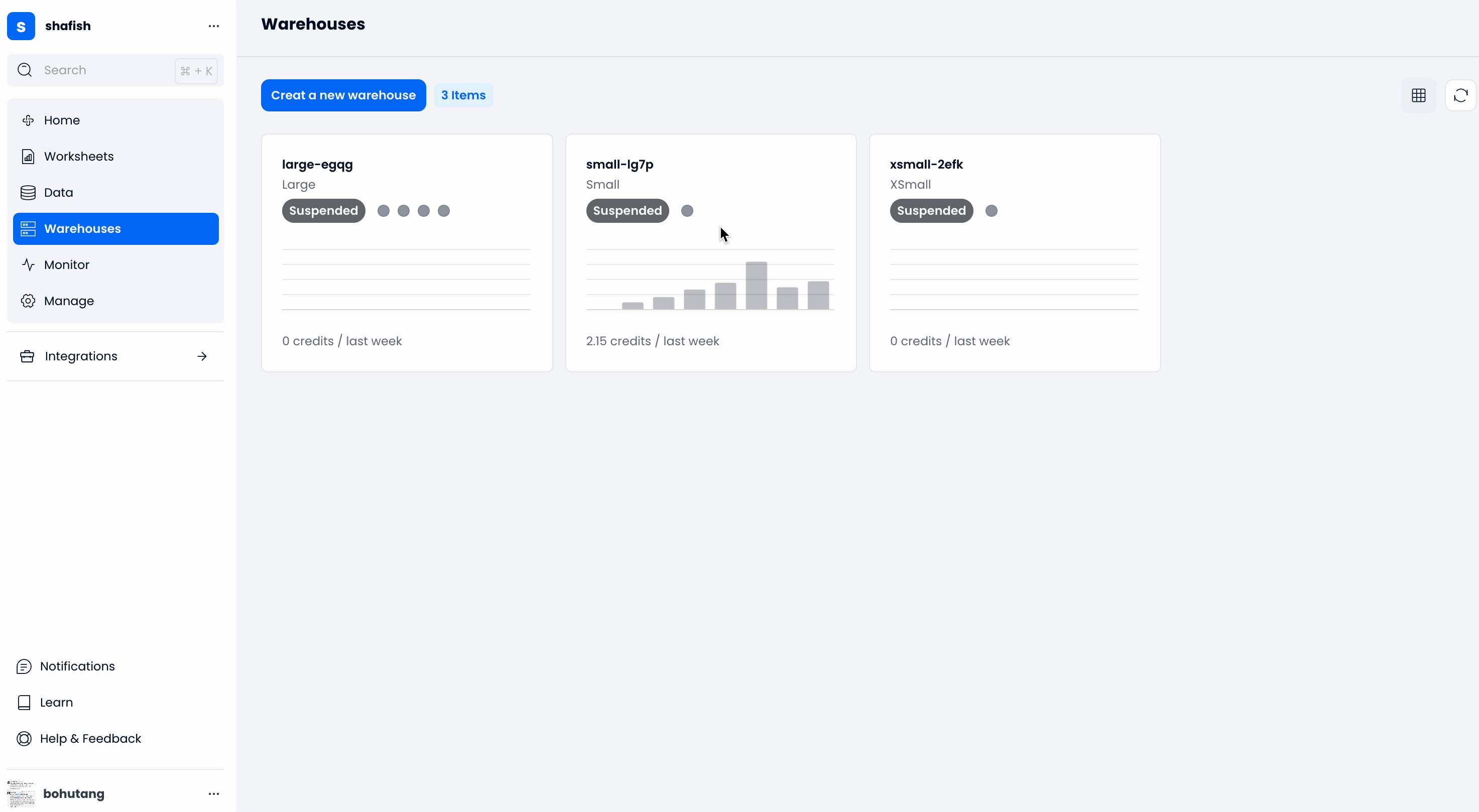 A warehouse comprises of computing resources such as CPU, memory, and local caches, which can be tailored to your specific computing needs by creating warehouses in varying sizes. In Databend Cloud, a warehouse is necessary for executing queries and performing data loading or unloading tasks.