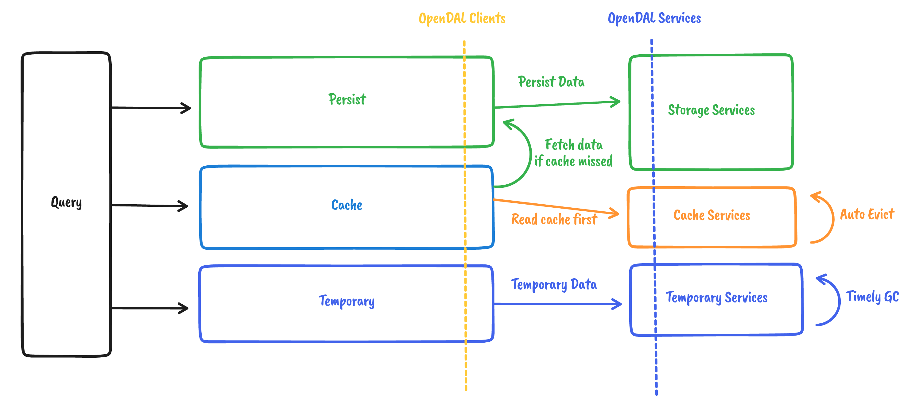 Storage, cache, and temporary services we mentioned here are both OpenDAL-supported services. The difference is: