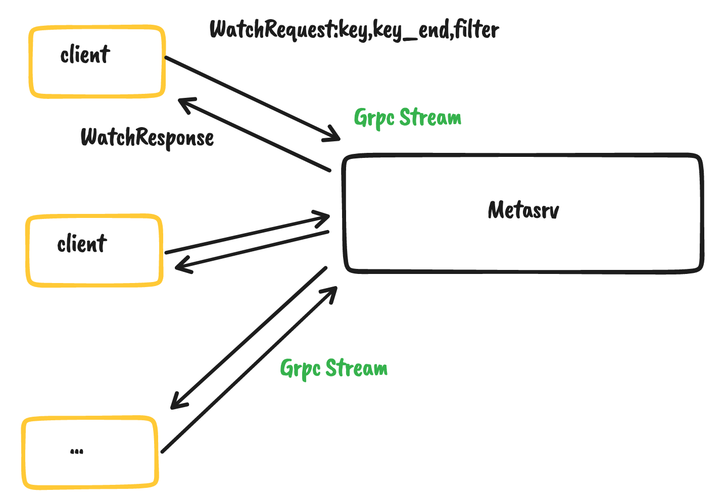 Every time a watch request is received, a Grpc stream is created. Every time the watched key changes, databend-meta uses the created stream to notify the client.