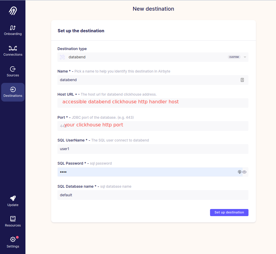 Setup Databend destination